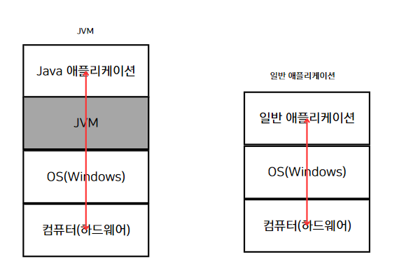 자바로 작성된 애플리케이션은 모두 이 가상 컴퓨터(JVM)에서만 실행되기 때문에,